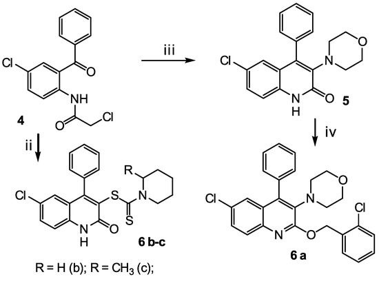 Synthesis of the target compounds (6 a-c). Reagents and conditions: (ii) dry DMF, CHCOOK, piperidine-1-yldithiocarboxylic acid (b) or 2-methylpiperidine-1-yldithiocarboxylic acid (c), 80 °C, 6 h; (iii) dry CHCN, morpholine, reflux, 3 h; and (iv) dry DMF, CsF, 2-chlorobenzyl chloride, reflux, 4 h.