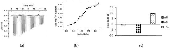 In recent years, several methods have been developed to study the interaction mechanisms between proteins and ligands [28,29,30,31,32], such as isothermal titration (ITC), surface particle resonance, nuclear magnetic resonance wave, ultracentrifugation analysis, the fluorescence resonance energy transfer method and so on. ITC is an efficient biophysical method to study the interaction mechanisms between two molecules by calculating the heat change [33,34]. Compared with the other methods, this method is simpler, has higher efficiency, has a wider application range and is a label-free procedure. This method is gradually being applied to study interaction mechanisms between small molecules and biological macromolecules.