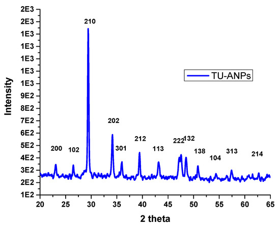 FTIR spectral analysis (Figure 1) revealed that: IR absorption bands located at 3428, 3240, 1999, 1427 wavenumbers cm−1 correspond to N-H stretching; and O-H, C-N and C=S are associated with thiourea and vibrational bending at 1032 and 520 wavenumbers cm−1, representing PO43− characteristics in the apatite-validating capping of thiourea on the surface of ANPs (Figure 1). The FTIR study validates the fact that displacement of the C=S stretch is indicative of the binding of thiourea via this group to the core ANPs, hence functionalizing the surface of ANPs and preventing an agglomeration of particles. Consequently, the medium is stabilized. The XRD pattern showed intense diffraction peaks at 2θ; 31.77, 32.90, 35.95, 45.47, 49.23, 57.80, 62.85, 68.49 and 25.96 and matched with JCPDS: 00-009-0432 as the standard diffraction spectra of apatite (Figure 2). SEM images revealed the spherical-to-oval morphology of TU–ANPs with an intense agglomerated Ostwald ripening, where the size ranged between 40 nm to 220 nm in diameter (Figure 3). EDX spectra showed the presence of calcium (Ca) at 3.9 and 4.0 KeV, while phosphorus intensity was observed around 2.0 KeV, which is characteristic of ANPs. The presence of nitrogen, carbon and sulfur in traces are due to the capping of thiourea on the surface of ANPs (Figure 3).