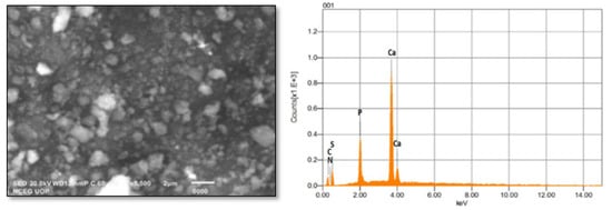 SEM–EDX analysis of TU–ANPs showing intense agglomeration due to Ostwald ripening where the size ranges from 40 nm to 220 nm, and characteristic signals of P and Ca of apatite at given KeV.