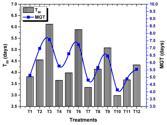 where Ni is the number of seeds germinated on the day; (Ti) is the time (days); G1 is the germinated seeds on the first day (D1); Gf is the final germinated count on the final day (Df); N is the number of seeds germinated on the final day; Na and Nb are the respective cumulative germination at Ta and Tb (times in days); Gt is the total number of germinated seeds; and Nt is the total number of seeds.