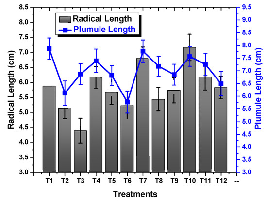 NaCl-based osmotic stress not only causes a reduction in GP but also delays the time to germination (MGT and T50). This is due to its negative effect on mitotic cell division and cell elongation, altering enzyme activity particularly associated with protein synthesis, as well as growth hormones [18]. Figure 4, Figure 5 and Figure 6 show that the application of TU–ANPs significantly stabilize germination indices by not only providing minerals source of calcium, phosphorus and nitrogen, but also by triggering biosynthetic pathways associated with sugar phosphates, nucleotides, NADH, amino acids and growth hormones, such as IAA. Meanwhile, thiourea is also known for breaking environmentally imposed seeds, as well as innate seeds and innate bud dormancy, hence resulting in the early onset of seed germination and the establishment of seedling growth [19,20].