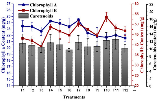 Plants exposed to NaCl-based osmotic stress significantly declined their photosynthetic pigments (Chl a, Chl b and carotenoids). A minimal chlorophyll b content of 39.15 mg/g was recorded in plants subjected to 100 mM NaCl-based osmotic stress, whereby a maximum chlorophyll b content of 53.51 mg/g was recorded in plants treated with 10 µg/mL of TU–ANPs via the foliar route grown under the non-saline condition. This was followed by 50.20 mg/g in plants treated with 5 µg/mL of TU–ANPs. Similarly, chlorophyll a content in plants was also subjugated to decline due to osmotic stress in a dose-dependent manner (Figure 7). An almost similar pattern of values was also reported for carotenoid levels, where its highest value of 12.54 mg/g was recorded in plants with under 100 mM of NaCl-based salinity and which were treated with 10 µg/mL of TU–ANPs. Plants with under 100 mM NaCl-based osmotic stress were observed with a mean chlorophyll a level of 22.65 mg/g, whereby in non-saline plants, the value 23.45 mg/g was recorded for chlorophyll a content. Application of TU–ANPs at an optimal experimental dose (5 µg/mL) elevated the chlorophyll a level to 24.39 mg/g; meanwhile, at a higher dose of TU–ANPs, a decline (21.83 mg/g) in chlorophyll a levels was reported (Figure 7). Likewise, foliar application of TU–ANPs in maize plant under osmotic stress significantly affected levels of osmolytes (protein, sugar and proline). A total of 39.8 mg/g of protein was recorded in plants treated with 10 µg/mL of TU–ANPs under a non-saline condition, whereas 24.0 mg/g of leaf protein content was recorded in untreated plants (hydro-applied) under 100 mM of NaCl-based osmotic stress. The results obtained clearly indicate that the application of TU–ANPs optimized the level of protein, hence amplifying the growth performance of plants under osmotic stress (Figure 8). Likewise, proline content (74.1 mg/g) was also ameliorated via the application of 10 µg/mL of nanoparticles, compared to (60.0 mg/g) plants subjected to hydro-application and 100 mM NaCl-based osmotic stress (Figure 8). However, total soluble sugar was non-significantly affected by osmotic stress, whereby its highest value was obtained at T10 (10 µg/mL NPs), followed by T1 (hydro-applied) and T7 (5 µg/mL NPs). Meanwhile, the lowest level (256.2 mg/g) was reported at T6 (1 µg/mL NPs + 100 mM NaCl).