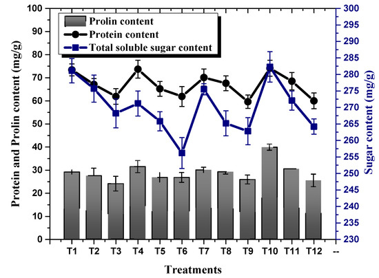 Sugar was extracted by homogenizing leaves in dH2O, centrifuged at 8000 rpm; to the supernatant, 80% of phenol and 5 mL of concentrated H2SO4 was added. The OD of the reaction mixture was recorded at 420 nm, and the total soluble sugar was estimated using a standard sugar curve. The amount of proline was determined by following the procedure given by Zhang [43]. Proline was extracted through aqueous sulfosalicylic acid. To the filtrate, acid ninhydrin was added, and the reaction mixture was heated at 100 °C. After cooling in an ice bath, toluene was added to the reaction mixture, and the OD of the toluene-aspired layer was measured at 520 nm.