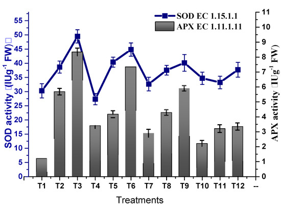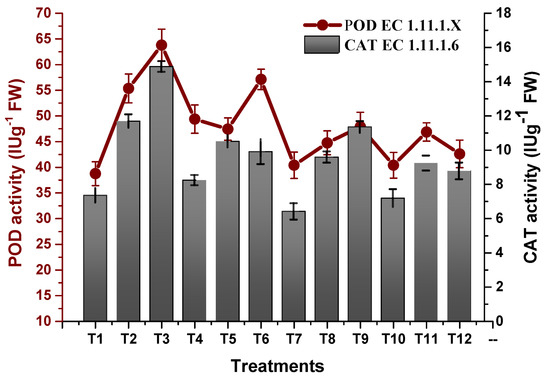 Osmotic stress inducing oxidative stress with the production of oxidative free radicals led to a decline in plant growth. TU–ANPs significantly coped with free radicals by triggering the antioxidative biosystems of plants, hence optimizing the activity of antioxidant enzymes. The activity of SOD was significantly enhanced from 30.28 IU/G FW in non-saline plants to 49.48 IU/g FW in plants subjected to 100 mM NaCl-induced osmotic stress. Foliar application of TU–ANPs at 10 µg/mL significantly reinstated the activity of SOD to 37.7 IU/g FW in plants under the highest experimental osmotic stress (Figure 9). A similar trend in the incline of POD activity (63.79 IU/g FW) was recorded at T3 (100 mM NaCl) against 38.76 IU/g FW at T1 (non-saline). The application of TU–ANPs at T7 and T10 significantly stabilized POD activity to 47.90 and 42.61 IU/g FW against the 63.79 IU/g FW value at T1 in plants under elevated osmotic stress. A similar trend in the elevation of APX and CAT activities was reported under osmotic stress, whereby TU–ANPs standardized their respective activities to 3.33 and 8.76 IU/g FW (T12) against 5.67 and 11.68 IU/g FW in hydro-applied plants (T3) under elevated (100 mM NaCl) osmotic stress (Figure 10).