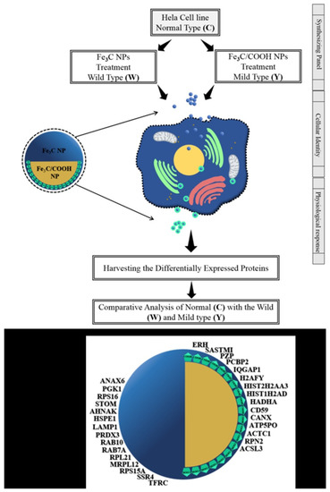 The following supporting information can be downloaded at: https://www.mdpi.com/article/10.3390/molecules27185754/s1, Figure S1: Ultraviolet-visible (UV-vis) and Fourier transform infrared (FTIR) spectra of coated and uncoated NPs; Table S1: Total differential proteins of HeLa cells around Fe2C NPs; Table S2: Tame-type proteins (CW); Table S3: Mild-type proteins (CY); Table S4: Wild-type proteins (WY); Table S5: Common proteins in CW-CY; Table S6: Common proteins in CW-WY; Table S7: Common proteins in CY-WY; Table S8: Common proteins in CWY; Table S9: Unique proteins in CW; Table S10: Unique proteins in CY; Table S11: Unique proteins in WY.