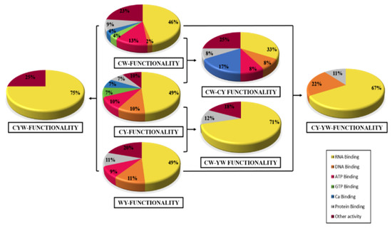 To obtain further insights, a comparative analysis was made between the functionality of differentially expressed proteins in different groups, i.e., tame, mild and wild (56:41:45). The results showed that these groups proteins comprised 46%:49%:49% RNA, 2%:10%:11% DNA, 13%:10%:9% ATP, 4%:7%:0% GTP, 4%:7%:0% calcium ion, 9%:7%:11% other protein-binding proteins and 23%:10%:20% different activity proteins (Figure 6). In addition, 12 proteins were found to be common in tame–mild, having 33% RNA, 8% ATP/ADP, 8% DNA, 17% calcium ion, 8% protein-binding proteins and 25% different activity proteins. Similarly, tame–wild had nine proteins in common, out of which 71% (RNA) and 12% (protein) were binding and 18% other activity proteins. Mild–wild had 17 proteins in common, containing 67% RNA, 22% DNA and 11% different types of protein-binding proteins. However, there were four common proteins in tame–mild–wild, which comprised 75% RNA binding proteins and 25% other activity proteins.