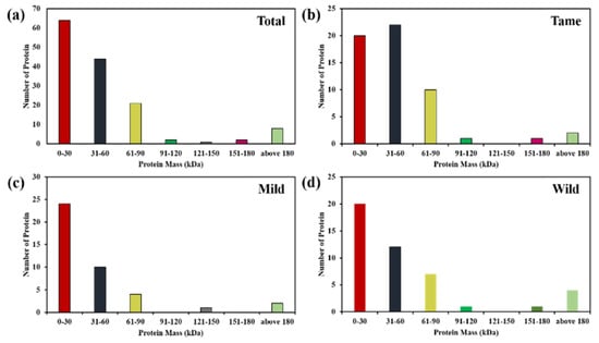 Further comparison was made based on relative abundance of identified proteins. The proteins were quantified by different ranges of molecular masses (kDa) starting from 0–180 kDa, and evaluation was given in the form of bar charts (Figure 7). The comparative analysis of total identified protein in tame–mild–wild demonstrated that out of 142 differentially expressed proteins, 64, 44, 21, 2, 1, 2 and 8 proteins have molecular masses in the range of 0–30 kDa, 31–60 kDa, 61–90 kDa, 91–120 kDa, 121–150 kDa, 151–180 kDa and above 180 kDa, respectively. Based on the proteins’ masses, the respective protein numbers in individual tame: mild: wild are 20:24:20, 22:10:12, 10:4:7, 1:0:1, 0:1:0, 1:0:1 and 2:2:4, respectively.