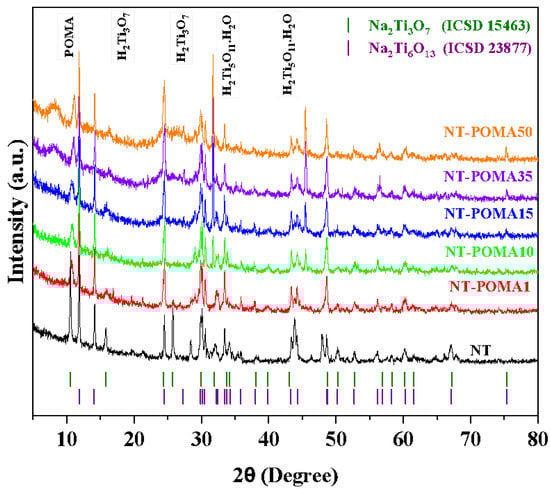 Diffraction patterns for NT, NT-POMA1, NT-POMA10, NT-POMA15, NT-POMA35 and NT-POMA50. The vertical lines indicate the Bragg peaks of Na2Ti6O13 and NaTi3O7 from the ICSD cards n° 23,877 and 15,463, respectively. The labels NT, NT-POMA1, NT-POMA10, NT-POMA15, NT-POMA35 and NT-POMA50 correspond to 0.0%, 0.1%, 10%, 15%, 35% and 50% of POMA content, respectively.