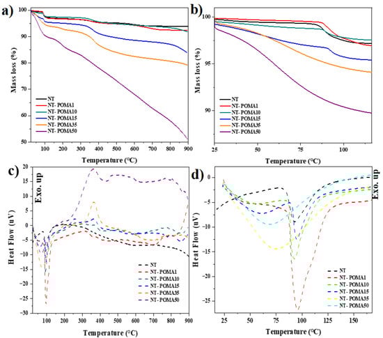 The TGA curves of NT-POMA35 and NT-POMA50 composites presented three thermal events of mass loss below 500 °C. The first one was observed between 25 °C and 100 °C, which was accompanied by endothermic peaks around 70 °C. A second mass loss occurred from 100 °C to 230 °C, followed by small endothermic peaks around 200 °C. Finally, in the region between 230 °C and 450 °C, there was the third thermal event with endothermic peaks located close to 363 °C. The mass loss of NT-POMA50 composite above 500 °C became much more severe.