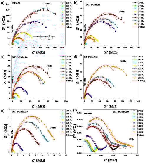 Isotherms of the Cole–Cole diagrams, with the behavior of the real (Z’) and imaginary (Z’’) part of the complex impedance for all the composites. The red lines correspond to fits using the equivalent circuit model. (a) NT, (b) NT-POMA1, (c) NT-POMA10, (d) NT-POMA15, (e) NT-POMA35 and (f) NT-POMA50 samples correspond to 0.0%, 0.1%, 10%, 15%, 35% and 50% of POMA content, respectively. The equivalent circuit used for the fit is shown in the inset of Figure 3a.