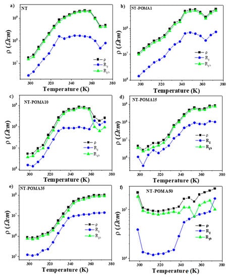 The composites NT, NT-POMA1 and NT-POMA10 presented similar behaviors. The Cole–Cole semicircles diameter first increases with temperature up to 348 K, and then starts to decrease. From the point of view of electrical resistivity, this behavior can be seen as an initial increase in resistivity, followed by a decrease at higher temperatures. This increase in electrical resistivity with the temperature is unexpected in ceramics. In the case of the NT-POMA15 and NT-POMA35 composites, the diameter of the semicircles increased continuously as a function of temperature. This behavior can be attributed to the higher concentration of POMA, suggesting that in the composites of lower POMA concentration, the polymer is responsible for the drop in resistance at higher temperatures. It is reasonable to consider that an increase in POMA concentration in the ceramic matrix leads to the superposition of the conduction mechanisms of both materials. This would account for the decrease in the semicircles diameters in the Cole–Cole diagrams taken at the same temperature for all POMA concentrations. In the case of the NT-POMA50 composite, the behavior observed in the Cole–Cole diagram at different temperatures suggests that the conductivity of the polymer is becoming dominant. This suggests that for the higher concentrations of POMA, the decrease in the diameters of the Cole–Cole semicircles is controlled mainly by the POMA mass. As observed in Figure 3f, different from the other samples, now the semicircles do not close in the high frequency region. The behavior of this region is attributed to the response of the most homogeneous and semiconductor part of the ceramic material, that is, the grain.