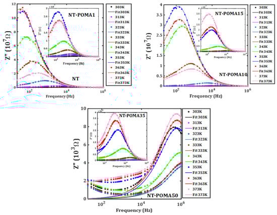 Frequency dependence of the imaginary component of the impedance from 303 K to 373 K. The samples NT, NT-POMA1, NT-POMA10, NT-POMA15, NT-POMA35 and NT-POMA50 correspond to 0.0%, 0.1%, 10%, 15%, 35% and 50% of POMA content, respectively.