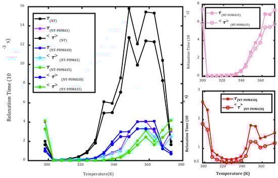 Temperature dependence of the average relaxation time <τ> and the relaxation time τ in the frequency domain for each sample. The data was obtained from the complex impedance formalism.