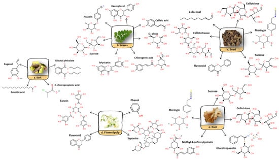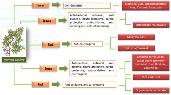 Each part of the M. oleifera carries its own benefits, and the most widely studied parts are the leaves and seeds. The high polyphenolic contents in M. oleifera have been suggested to be one of the significant contributory factors to its beneficial effects on health. For instance, a study has reported that the ethanolic extract of M. oleifera leaves has been characterized by a high content of flavonoid constituents, such as isoquercetin, quercetin and kaempferol [7]. These compounds contribute to many of its pharmacological properties [8]. The bioactive compounds of M. oleifera have presented many remarkable medicinal properties with various potential biological activities. Therefore, this review encompasses previous studies on the effects of different parts of M. oleifera and its pharmacological properties.