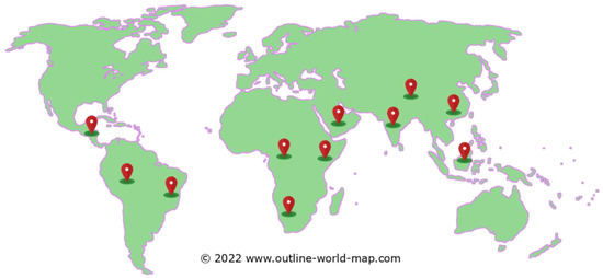 M. oleifera is native to South Asia and is originally found in northeast Pakistan to northern West Bengal and India [5,6]. However, as its nutritional potential has been massively studied, it has been introduced to many parts of the world and is currently present and grows in almost all tropical countries (Figure 2). This has been possible as the growing environment for M. oleifera is atypical, where it can grow well in tropical and subtropical countries with conditions that are dry to moist tropical with annual precipitation of 760 to 2500 mm.
