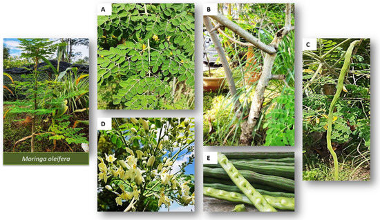 A botanical description of the M. oleifera plant has reported that the tree can usually reach a height of 10–15 m with an approximate diameter of 45 cm and an abnormal-looking bole that is forked from the roots. The bark of the trees is smooth and fair in texture with toned-down shading and pale yellow color. The crown is often described as umbrella shaped with a spread opening with twigs and shoots that are short and bristly. The leaves can grow up to 90 cm long in alternate and opposite pinnae in inverse sets 5 cm up from the stalk of softwood [26]. Moreover, the flower of M. oleifera also has aromatic fragrance and five uneven petals that are a little longer that the sepals (Figure 3).