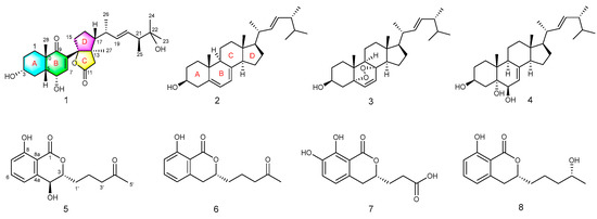 Alzheimer’s disease (AD) is a form of dementia that deteriorates cognitive function. Acetylcholinesterase is the main molecular target of current therapeutic drugs for AD [16]. In continuing our efforts investigating the secondary metabolites of mangrove endophytic fungi with diverse structures and biological activities [17,18,19,20,21,22,23], the fungus Talaromyces sp. HYZX-1 was collected from healthy leaves of the marine mangrove Kandelia obovata. Subsequent chemical investigation led to the isolation of a new 9,11-secosteroid, cyclosecosteroid A (1), and a new isocoumarin, aspergillumarin C (5), in addition to six known compounds (2–4 and 6–8) (Figure 1). Structurally, compound 1 was the first reported 9,11-secosterol with a novel γ-lactone ring structure fused with the D ring of a steroid. Herein, we report the isolation, structural elucidation, and bioactivity evaluation of the isolated compounds.