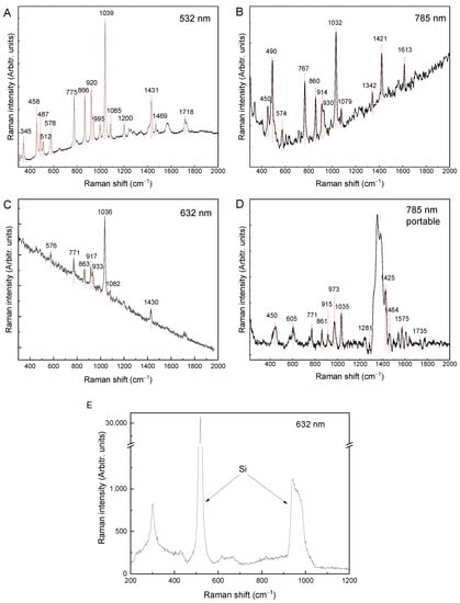 Raman spectra of glyphosate powder recorded with different laser excitations: (A) 532 nm (B) 785 nm, (C) 632 nm, (D) 785 nm (portable Raman; baseline corrected), and (E) Raman spectrum of 10 mM glyphosate solution excited at 632 nm on Si wafer.
