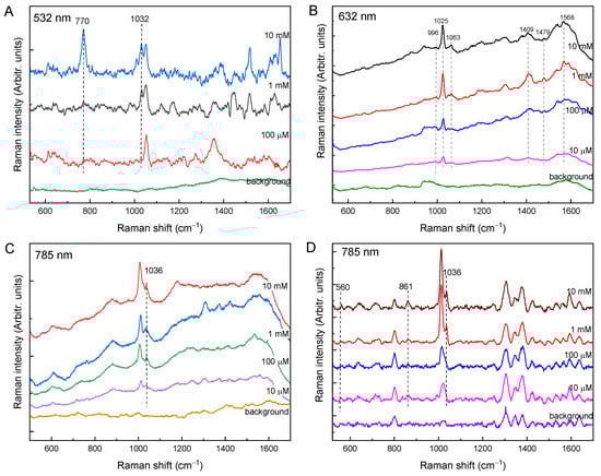 SERS spectra of different glyphosate concentrations: (A) with Ag NPs at 532 nm excitation; (B) with Au NPs at 632 nm excitation; (C) with Au NPs at 785 nm excitation; (D) with Au NPs at 785 nm excitation (baseline corrected; portable Raman).