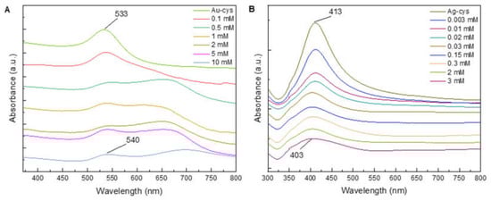 UV–Vis absorption spectra after the addition of different concentration of glyphosate for: (A) Au NPs and (B) Ag NPs.