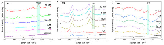 SERS spectra of different glyphosate concentrations with cysteamine-modified NPs: (A) Ag with 532 nm excitation, (B) Au with 632 excitation and (C) Au with 785 nm excitation. (cys: cysteamine powder).