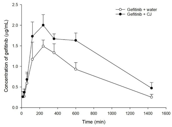Gefitinib, a selective epidermal growth factor receptor tyrosine kinase inhibitor (EGFR-TKI), is clinically used for the treatment of locally advanced or metastatic non-small-cell lung cancer [8]. In the pharmacokinetic aspect, the absorption of gefitinib was moderately slow [9], the bioavailability was 57–59% and the elimination half-life was longer than 24 h [10]. The transport of gefitinib was mediated by P-glycoprotein (P-gp) and breast cancer resistance protein (BCRP) [8,11], and its metabolism was mainly catalyzed by cytochrome P450 (CYP) 3A4 and CYP2D6 [8,10]. The excretion of gefitinib was predominantly via feces, with less than 7% via the renal route [8]. In this study, gefitinib was employed as a probe substrate of P-gp, BCRP, CYP3A4 and CYP2D6, and the effect of CJ ingestion on the pharmacokinetics of gefitinib was investigated in rats.
