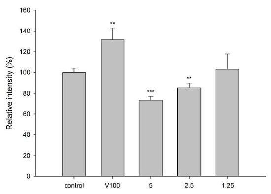 Effect of CJ (mg/mL) on the intracellular accumulation of R123 in LS 180 cells. V: verapamil (100 μM, positive control of P-gp inhibitor). ** p < 0.01 and *** p < 0.001.
