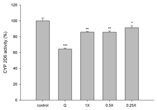 Effects of CM (1-, 0.5- and 0.25-fold serum concentration) on the activity of CYP2D6. Q: quinidine (10 μM in blank serum, positive control of CYP2D6 inhibitor). * p < 0.05, ** p < 0.01 and *** p < 0.001.