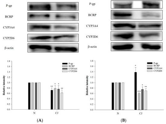 After administration of CJ and water individually, rats (n = 3 in each group) were sacrificed by inhaling CO2, and then the organs, including ileum and liver, were removed, blotted dry with filter paper and accurately weighed. The tissues were homogenized and lysed with radioimmune precipitation (RIPA) buffer (Merck, Darmstadt, Germany) and collected. Furthermore, the samples were separated by 10% SDS-polyacrylamide gel electrophoresis and then transferred onto polyvinylidenedifluoride membranes. The membranes were blocked at room temperature for 1 min in the blocking buffer (Goal Bio, TW) and then washed 3 times with 0.1% TBST (Tris-buffered saline with 0.1% Tween® 20 detergent). After washing, the blots were incubated with P-gp, BCRP, CYP3A4, CYP2D6 and β-actin primary antibodies, individually, at 4 °C overnight. Then the blots were washed 3 times with 0.1% TBST and reacted with secondary antibodies at room temperature for 1 h. The blots on the membranes were visualized by ECL reagent (Advansta Inc., San Jose, CA, USA) and detected by using Amersham ImageQuant800 (Cytiva Inc., Marlborough, MA, USA). Then, the protein levels were calculated by using Multi Gauge V3.0 software.