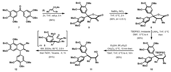 In a forward manner (Scheme 2), this synthesis began with a zinc-mediated Barbier reaction of diaryl ketone 7 and crotyl bromide 8 [7]. This reaction still proceeded well in gram-scale, and the generated intermediate spontaneously cyclized to form α-exo-methylene-γ-lactone 9 in one-step and 84% yield. With all the carbon atoms of Sacidumlignan B in hand, the next redox reactions were carried out. First of all, the double bond in 9 was reduced. The NaBH4 and NiCl2 combination in icy THF proved to be an optimal condition [8], and α,β-dimethyl-γ-lactone 6 as the inconsequential diastereomers (dr = 2.5:1) was thus obtained in 92% yield. The subjection of 6 to the reduction by LiAlH4 followed by a selective tert-butyldiphenyl silyl (TBDPS) protection of the resultant diol, afforded monoalcohol 10 in 90% yield. The remaining tertiary alcohol was then reduced by Et3SiH under the assistance of BF3∙Et2O [9], and the subsequent deprotection of TBDPS group in the resulting silyl ether delivered the primary alcohol 11 in 90% yield. Oxidation of this alcohol by IBX followed by acid-promoted dehydrative Friedel-Crafts cyclization of the generated aldehyde 5 with a pseudo-half-chair conformation where aryl and the adjacent methyl are oriented at respective equatorial position, eventually established the trans-7′,8′-dihydronaphthalene skeleton with a diarylmethine stereocenter [10] and therefore gave benzyl-protected Sacidumlignan B (12) in 81% overall yield.