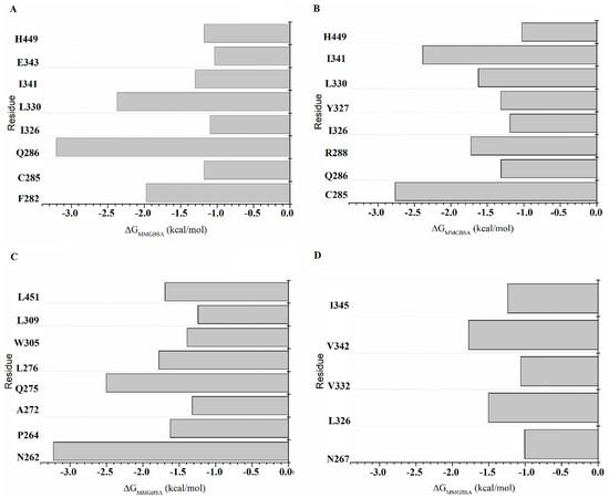 Table S3 shows the energies for each residue participating in the protein–ligand interactions of the RXRα-PPARγ and RXRα-PPARγ-DNA systems. In the RXRα-PPARγ-DNA system, the major contributors to the binding affinity (ΔGMMGBSA ≥ 1.0 kcal) in the PPARγRZG complex are F282, C285, Q286, I326, L330, I341, E343, and His449 (Figure 4A). Of these residues, E343 forms HBs through its polar backbone atoms and side chain with the TZD headgroup (Figure 2A,C,E), whereas the rest stabilize RGZ through hydrophobic interactions. For the PPARγRZG complex in the RXRα-PPARγ-DNA system (Figure 4B), the major contributors to the affinity are C285, Q286, R288, I326, Y327, L330, I341, and H449 (Figure 3A,C,E). These residues mostly form hydrophobic interactions. Comparison of RGZ stabilization in both systems revealed that this ligand is better stabilized in the RXRα-PPARγ-DNA system, with more residues contributing to the binding affinity.