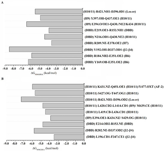 Table S4 lists the energies for each protein–protein interaction that maintains the RXRα-PPARγ and RXRα-PPARγ-DNA systems. In the RXRα-PPARγ system, the main sources of the binding free energy in the heterodimeric complex are Y169, R184, Y192, R209, N216, E219, E394, Y397, and R421 for RXRα (Figure 5A). Of these residues, Y169, R184, Y192, N216, and E219 are localized along the DBD, whereas E394 and R421 belong to H9 and H10/11, respectively. Regarding PPARγ, R153, D337, E351, E378, E396, Q430, K434, and Q437 are the main contributors to the complex affinity.