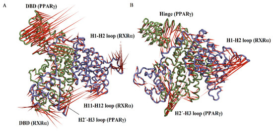 PCA was carried out to extract the most important eigenvectors. For the RXRα-PPARγ and RXRα-PPARγ-DNA systems, the first two eigenvectors (PC1 and PC2) contain the largest eigenvalues, contributing 48.0% and 43.0%, respectively, to the total fluctuation of the two systems. PC1 versus PC2 contains the main conformational states sampled by simulations for the RXRα-PPARγ (Figure 6A) and RXRα-PPARγ-DNA (Figure 6B) systems. This comparison provided information about the conformational complexity by reconstructing the FEL (Figure 6C,D). Projection of the motion in the phase space along the first and second eigenvectors (PC2 versus PC1) for the RXRα-PPARγ system (Figure 6C) covers a larger region in the essential subspace than that of the RXRα-PPARγ-DNA system (Figure 6D), suggesting a larger conformational entropy for the RXRα-PPARγ system. Graphical representation of the projection along PC1 and PC2 shows that RXRα-PPARγ system systems display the highest collective motions along DBD and H2’-H3 loop of PPARγ and one small portion of DBD-hinge, H1-H2 loop and H11-H12 loop of RXRα (Figure 7A). For RXRα-PPARγ-DNA system, the highest fluctuation is along the hinge and H2’-H3 loop of PPARγ and H1-H2 loop of RXRα (Figure 7B). The H2’-H3 loop in RXRα-PPARγ system showed a sliding motion, strongly associated to PPARγ surface and in close proximity to form interactions with H6-H7 loop (Figure S5A). In RXRα-PPARγ-DNA system, the H2’-H3 loop exhibited a flapping motion over the ligand binding site of LBD (Figure S5B). On the other hand, the differences in mobility of H11-H12 loop, localized at the entrance of RXRα binding site, may be responsible for the variations in affinity for 9CR (Table 1). These results indicates that reduction in the conformational mobility of DBD of PPARγ seems to be the main responsible in the differences in the distribution along the essential subspace.