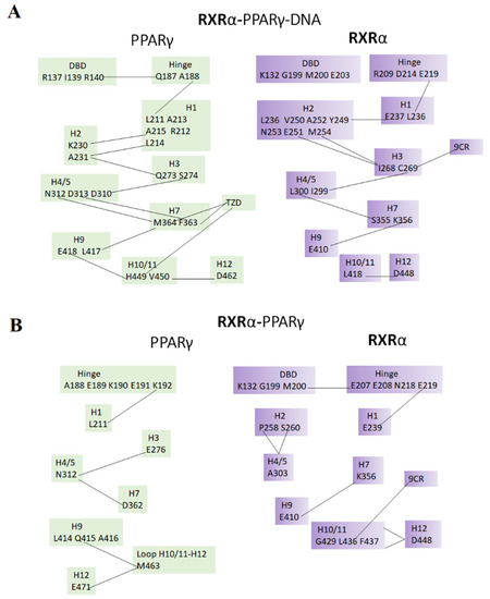Although both systems share several protein–protein interactions (Figure 5), those that contribute to ΔGMMGBSA are dissimilar, indicating that DNA binding by the RXRα-PPARγ system impacts the affinity as well as the type of interactions responsible for binding. Considering the protein regions that mostly contribute to ΔGMMGBSA, the structural domains that guide protein–protein recognition in the RXRα-PPARγ system are the DBD, H9, and H10/11 of RXRα, and the DBD, β2–β4, H6, H7, H8-H9 loop, and H10/11 of PPARγ. For the RXRα-PPARγ-DNA system, the domains are the DBD, the hinge, H9, and H10/11 of RXRα, and β2–β4, H8-H9 loop, H9, H10/11, and H12 of PPARγ.