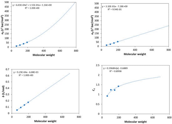 All the pure fluid parameters needed for calculations of this study were adopted from the literature except for the parameters of glycols, which were estimated by adjusting the model predictions to DIPPR data for vapor pressures and liquid molar volumes [32]. All parameters used in this study are presented in Table 1. For glycerol, the 3 × 2B association scheme is used to describe the self-associating behavior since glycerol contains three hydroxyl groups in each molecule [7]. In addition, here, it is worth mentioning that the parameters of triolein were predicted using the correlations presented by Tsivintzelis et al. [7] due to lack of (confirmed) experimental data.Since experimental data for vapor pressures do not exist for various polyethylene glycols, the estimation of the CPA pure fluid parameters becomes difficult. Many studies showed that the estimation of pure fluid parameters of various models, including the SAFT type ones and lattice fluid theories, by using only volumetric properties does not result in optimum parameters for phase equilibrium calculations of binary systems [33]. For this reason, various approaches to predict such parameters were developed, including group contribution methods [33,34,35]. Using the CPA model for compounds of the same family, it was shown that the co-volume parameter, b, is a linear function of molecular weight (or the van der Waals volume of the fluid), the c1 parameter reaches a plateau for relatively high molecular weights, while the energetic parameter, a0, of the physical term shows a linear or a mild polynomial dependence from molecular weight (or the van der Waals volume of the fluid) [7,17,28]. However, it was shown that appropriate correlations of the three physical CPA parameters are facilitated when the association parameters are kept constant for all fluids of the same family since the two energetic parameters, i.e., the a0 and ε parameters, are highly correlated to each other [7]. Having in mind such findings for the CPA model, correlations of the pure fluid parameters for glycols were estimated as presented in Figure 1. For a0, both a linear and a second-order polynomial dependence was used. Such correlations allow for the prediction of pure fluid parameters for polyethylene glycols of various molecular weights, as shown in Table 2. The critical temperature reported in Table 2 was predicted using the Joback’s group contribution method for the closest ethylene glycol [36].