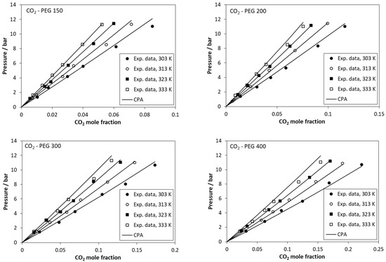 Solubility of CO2 in polyethylene glycols. Experimental data (points [38]) and CPA calculations (lines) using the kij values of Table 3.