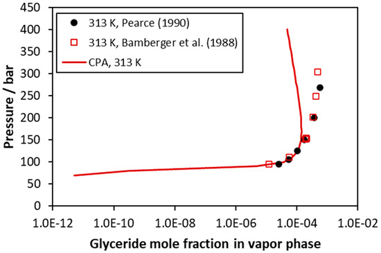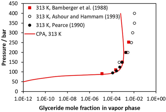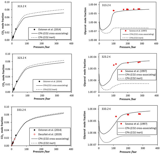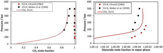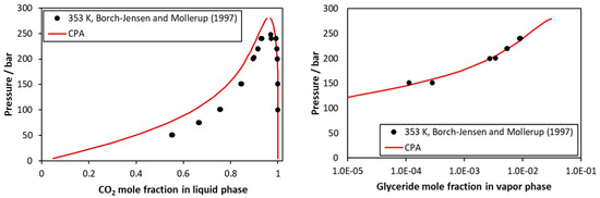 The following supporting information can be downloaded at: https://www.mdpi.com/article/10.3390/molecules27185785/s1, Figure S1: CO2–glycerol VLE. Glycerol mole fraction in the vapor phase. Experimental data and CPA correlations using the interaction parameters of Table 4 of the main article; Figure S2: CO2–glycerol VLE. CO2 mole fraction in the liquid phase. Experimental data [41,42] and CPA correlations using the interaction parameters of Table 4 of the main article; Figure S3: CO2–glycerol VLE. CO2 mole fraction in the liquid phase. Experimental data [39,41,42] and CPA correlations using the interaction parameters of Table 4 of the main article; Figure S4: CO2–glycerol VLE. CO2 mole fraction in the liquid phase. Experimental data [42] and CPA correlations using the interaction parameters of Table 4 of the main article; Figure S5: CO2–glycerol VLE. CO2 mole fraction in the liquid phase. Experimental data [42] and CPA correlations using the interaction parameters of Table 4 of the main article; Figure S6: CO2–glycerol VLE. CO2 mole fraction in the liquid phase. Experimental data [39] and CPA correlations using the interaction parameters of Table 4 of the main article; Figure S7: CO2–tricaprilyn VLE at 313 K. Experimental data [43,44] and CPA correlations using the binary parameter of Table 5 of the main article; Figure S8: CO2–tricaprilyn VLE at 393 K. Experimental data [43] and CPA correlations using the binary parameter of Table 5 of the main article; Figure S9: CO2–tributyrin VLE at 288 K. Experimental data [44,45] and CPA correlations using the binary parameter of Table 5 of the main article; Figure S10: CO2–tributyrin VLE at 303 K. Experimental data [44,45] and CPA correlations using the binary parameter of Table 5 of the main article; Figure S11: CO2–tributyrin VLE at 338 K. data [44,45] and CPA correlations using the binary parameter of Table 5 of the main article; Figure S12: CO2–trilaurin VLE and LLE at 308 K. Experimental data [48,49] and CPA correlations using the binary parameter of Table 5 of the main article; Figure S13: CO2–trilaurin VLE at 328 K. Experimental data [48] and CPA correlations using the binary parameter of Table 5 of the main article; Figure S14: CO2–trilaurin VLE at 353 K. Experimental data [47] and CPA correlations using the binary parameter of Table 5 of the main article; Figure S15: CO2–trimyristin VLE at 308 K. Experimental data [48] and CPA correlations using the binary parameter of Table 5 of the main article; Figure S16: CO2–trimyristin VLE at 328 K. Experimental data [48] and CPA correlations using the binary parameter of Table 5 of the main article; Figure S17: CO2–triolein VLE at 313 K (vapor phase compositions). Experimental data [53,54] and CPA correlations using the binary parameter of Table 5 of the main article; Figure S18: CO2–triolein VLE at 323 K (vapor phase compositions). Experimental data [50,53,54] and CPA correlations using the binary parameter of Table 5 of the main article; Figure S19: CO2–triolein VLE at 333 K. Experimental data [51,52,53] and CPA correlations using the binary parameter of Table 5 of the main article; Figure S20. CO2–triolein VLE at 343 K. Experimental data [52,53] and CPA correlations using the binary parameter of Table 5 of the main article.