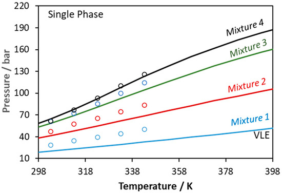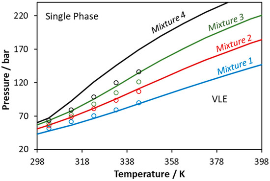 Phase boundaries for CO2–glycerol–ethanol ternary system. Experimental data (points, [56]) and CPA predictions using the binary interaction parameters of Table 6 (Mixture 1: xCO2 = 0.1333, xglycerol = 0.0413, xethanol = 0.8254; Mixture 2: xCO2 = 0.2808, xglycerol = 0.0342, xethanol = 0.6850; Mixture 3: xCO2 = 0.4276, xglycerol = 0.0273, xethanol = 0.5451; Mixture 4: xCO2 = 0.4985, xglycerol = 0.0239, xethanol = 0.4776).