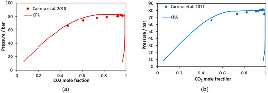 On the other hand, considering the CO2–glycerol-ethanol system shown in Figure 10, the model describes in a more accurate way mixtures that are rich in CO2. In this case, the average absolute deviation (in bubble point pressure) from the experimental data shown in Figure 10 [56] and Figure 11b [60] is equal to 14% and 2%, respectively.