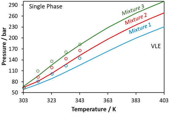 Phase boundaries for CO2–methanol–lauric acid ternary system. Experimental data (points, [57]) and CPA predictions using the binary interaction parameters of Table 6 (Mixture 1: xCO2 = 0.6675, xmethanol = 0.2217, xlauric acid = 0.1108; Mixture 2: xCO2 = 0.7492, xmethanol = 0.1672, xlauric acid = 0.0836; Mixture 3: xCO2 = 0.8248, xmethanol = 0.1168, xlauric acid = 0.0584).