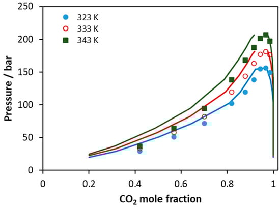 Finally, the CPA EoS was applied to predict the phase behavior of a CO2 mixture with a real biodiesel sample (Figure 13). The experimental data from Araujo et al. were used, and biodiesel was considered as a multicomponent mixture of C16:0, C18:0, C18:1, C18:2, and C18:3 methyl esters, according to the analysis mentioned in that study [58]. The CO2–methyl ester binary interaction parameters were adopted from Tsivintzelis et al. [7], while, since such compounds have similar molecular structure, the corresponding ester-ester binary interaction parameter was set equal to zero. The overall average absolute deviations of model predictions from experimental data in CO2 mole fraction is 8% (7% for 323 K, 8% for 333 K, and 10% for 343 K). It is observed that the deviation increases with temperature; however, the performance of the model is considered rather satisfactory if we take into account that calculations are pure predictions and also the complexity of such multicomponent mixture.