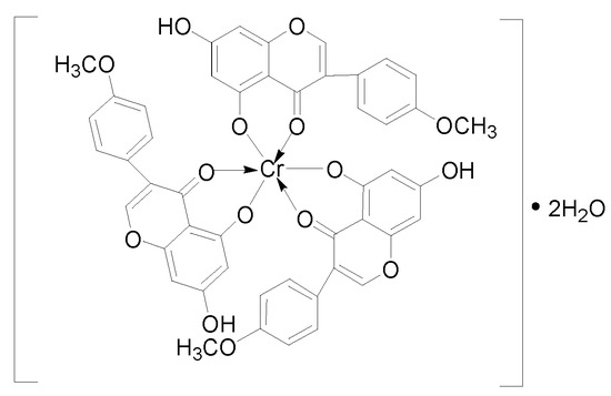 Therefore, dietary supplements, which can improve the carbohydrate balance, are very popular. Chromium(III) is a beneficial trace element for the human body. Chromium compounds exhibited hypoglycemic activity and could improve insulin sensitivity, lipid metabolism and insulin resistance [3,4,5,6]. Organic chromium compounds such as chromium picolinate, chromium nicotinate and chromium yeast have been widely used in functional foods and nutritional supplements. Chromium picolinate is the most widely used. However, chromium picolinate has been found to cause DNA toxicity, cytotoxicity and reproductive toxicity [7,8], and its toxicity was mainly due to its ligand [9,10,11]. Therefore, the development of some new organic chromium(III) complexes or functional chromium(III) food supplements in type II diabetes is a good solution, and the ligand plays an important role in improving the bioactivity and safety of chromium(III) complexes. Many types of chromium complexes have been obtained by changing the ligand. Such complexes include organic acid chromium complexes [12,13], organic amine chromium complexes [14,15], amino acid chromium complexes [16], polysaccharide chromium complexes [17,18], oligosaccharide chromium complexes [19], monosaccharide chromium complexes [20], flavonoid chromium complexes [21], peptide chromium complexes [22] and polyphenol chromium complexes [23], etc. Some of the chromium complexes, such as chromium malate, have been studied extensively and have good application value due to their hypoglycemic activity [24].