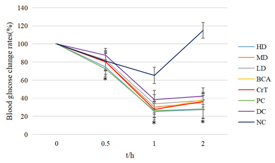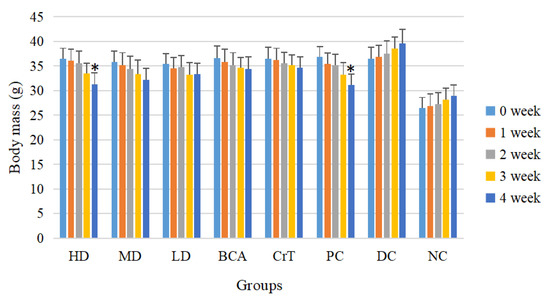 As shown in Figure 6, db/db mice were heavier, and the HD mice lost the most weight after treatment in all three test groups. The change in body mass in the HD group was statistically significant compared with that before treatment (p < 0.05). The body mass of the BCA group also decreased, but there was no significant difference compared with that before treatment (p > 0.05). The CrT group showed some weight loss, but there was no significant difference compared with that before treatment (p > 0.05). The activity of weight loss was also better in the PC group, and the difference was statistically significant compared with that before treatment (p < 0.05). The DC group continued to gain weight. The body mass of mice in the NC group showed a normal increase. The weight loss in the HD group was similar to that in the PC group.
