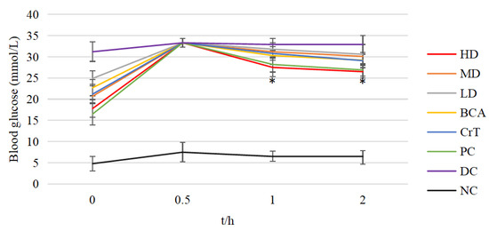 OGTT in each group of mice. Values are means ± SD (n = 7). The differences between these groups and the DC group were statistically significant (denoted by “*” for p < 0.05).