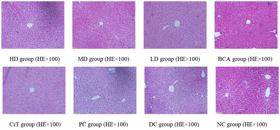 Figure 11 shows the pathological changes in the liver. NC group: The liver structure in mice was complete and clear. The hepatic plates and hepatic sinusoids were arranged radially around the central vein. No abnormal changes were noted in the liver sinus, and the structure was clear. Liver cells were polygonal, normal in shape, and the cytoplasm was distributed evenly. HD group and PC group: Liver cells were clear, with mild hepatic fibrosis, and the fatty degeneration of the liver was mild. MD group, BCA group and CrT group: The fatty degeneration of the liver was mild. The liver cells were clear and complete. The nuclear and cytoplasmic separation showed a significant improvement. The arrangement of cells was regular and the form of cells was complete. LD group: Hepatic cells developed serious fatty degeneration and exhibited cavitation. The nuclear and cytoplasmic separation was obviously serious. Partial hepatic cells were apoptotic. DC group: The boundaries of hepatic lobules in mice were relatively unclear. The structure of the liver sinus was blurred. The liver cells exhibited fatty degeneration and a disordered arrangement. The interspace in nuclear membranes was separated and the cytoplasm dissolved. Hepatic fibrosis was serious.