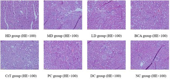 Figure 12 shows the pathological changes in the kidney. NC group: The glomerular volume was normal, and the capillaries were clearly visible. HD group and PC group: The glomerular volume was normal, and the renal tubules were slightly narrow. MD group, BCA group and CrT group: The glomerular volume was normal, and the kidney tubule interstitial spaces showed slight fibrosis. LD group: The glomerulus showed proliferation and hypertrophy. The glomerular basement membrane was hyperplastic. Partial renal tubular epithelial cells appeared granulovacuolar degeneration. DC group: The glomerular volume was increased and renal vesicles were fissured. The glomerular basement membrane was hyperplastic. Renal tubular epithelial cells displayed granulovacuolar degeneration.