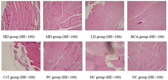 Figure 14 shows the pathological changes in skeletal muscle. NC group: The muscle tissue was arranged completely, regularly and clearly. The muscle cells were uniform in size, with no atrophy, oedema, necrosis or rupture of muscle cells, or proliferation of fibrous tissue. HD group, MD group and PC group: The muscle tissues were arranged regularly, and the muscle cells were even in size. Scattered foci of myocyte atrophy were observed. Myocyte edema was small in area and mild in degree. Mild inflammatory cell infiltration and muscle cell necrosis and rupture were rare. LD group, BCA group and CrT group: The arrangement of muscle tissue was disordered and the muscle cells were not uniform in size. Muscle cells showed mild atrophy. The area of muscle cell edema was large. Inflammatory cell infiltration was mild, and the area of focal muscle tissue rupture was large. No obvious fibrosis was observed. DC group: The arrangement of muscle tissue was disordered. The myocyte volume was reduced, and the atrophy was obvious. The area of muscle cell edema was large. Inflammatory cell infiltration was more obvious. The area of focal muscle tissue rupture was larger. No obvious fibrosis was observed.