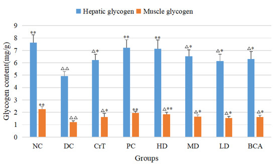 Effects of [CrBCA3] on glycogen levels in db/db mice. Values are means ± SD (n = 7). The differences between these groups and the NC group were statistically significant (denoted by “△” or “△△” for p < 0.05 or p < 0.01, respectively); the differences between these groups and the DC group were statistically significant (denoted by “*” or “**” for p < 0.05 or p < 0.01, respectively).