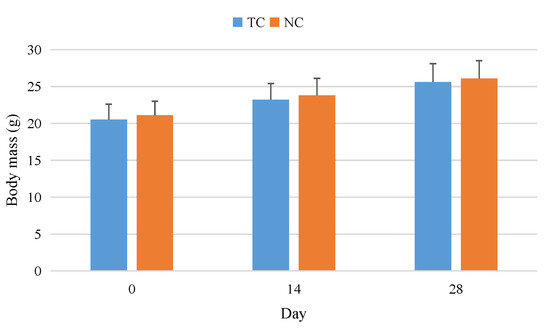 Comparison of body mass changes. Values are means ± SD (n = 7). There were significant differences in body weight before and after the experiment (denoted by “*” for p < 0.05).